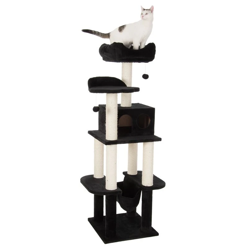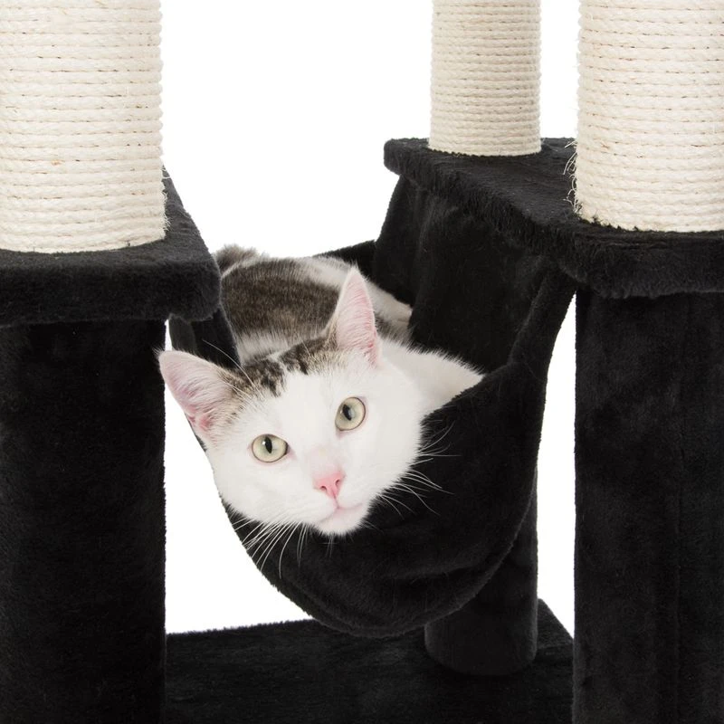 A spacious sleeping and play house on the second level offers your house cat a cosy retreat. The paw-shaped platform with edge is another highlight that invites you to lean back. The top platform is enthroned at the very top, from where your cat has a perfect view of its territory. The removable, cosy cushion provides extra sleeping comfort.