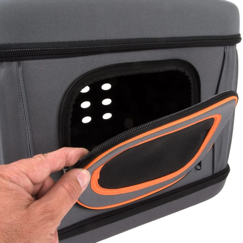 This stable Collapsible Transport Case is perfect for your pet’s every transport need, whether it be travelling to the vet or feeling comfortable on a longer journey. The grey travel case is decorated with orange highlights and is light, soft and practical, made from sturdy EVA-foam. The wide shoulder strap allows you to comfortably carry your pet and the generous air holes on either side allow optimum air circulation.