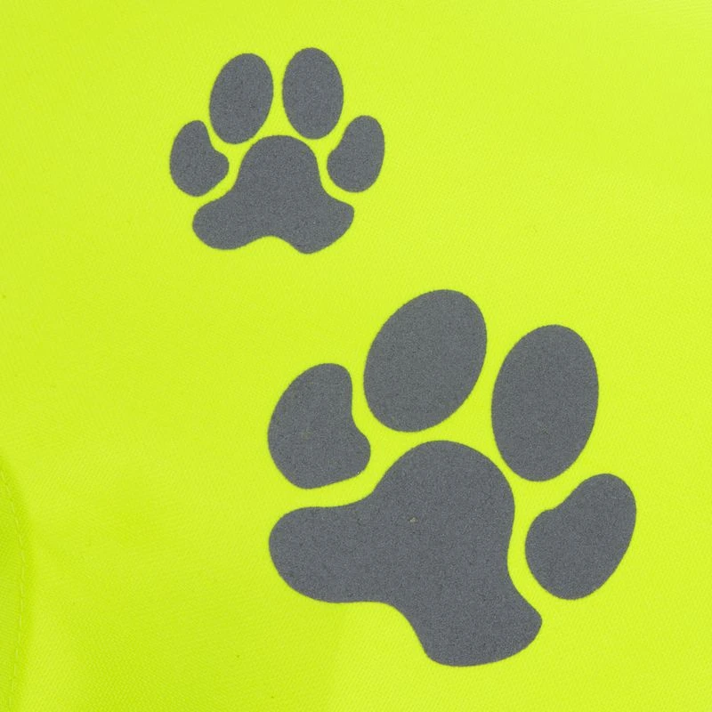 - Large reflective material: across the neck and tail area, with large reflective pawprints