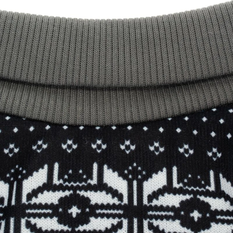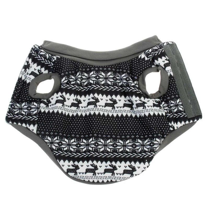 This gorgeous knitted pullover for dogs has a classic Norwegian pattern which is very fashionable this season. The black and white pullover is 100% knitted cotton and has a lovely snowflake and reindeer pattern. The soft, light grey fleece lining will keep your pet cosy warm. It also has a grey turtle neck and stretchy cuffs on the leg and tummy sections. It has Velcro tabs so it is easy to put on and take off and it is fully adjustable, so you can achieve the perfect fit for your dog.