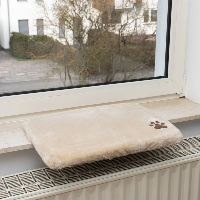 The seat is specially designed to be mounted on windowsills, shelves or tables and fits in with the style of any room thanks to its pleasant beige colour and decorative paw print. It is filled with soft padding and the fluffy cover is held in place by an elasticated boarder so can easily be removed. This seat is easy to mount onto the windowsill with the two brackets and can be adjusted so they fit just right.